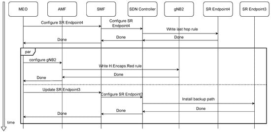 Figure A2 shows the control plane procedure for the path allocation. The MEO determines the appropriate SR policy to be enforced at SR Endpoint1. Based on that, it selects the corresponding BSID. For clarity, we assign label BSID1 to the selected BSID, which is an IPv6 address. This BSID serves as the designated destination address that gNB1 embeds within the IPv6 outer header to enforce the specified SR policy at Endpoint1. Firstly, the MEO asks the SMF to activate the SDN controller for the configuration of SR Endpoint3, as in the previous case. Then, the MEO instructs the SMF to trigger the SDN controller in configuring the End.M.GTP6.D rule on SR Endpoint1, if not installed yet, for the determined SR policy (BSID1). Finally, the MEO prompts the AMF to configure the GTP-U encapsulation rule on gNB1.