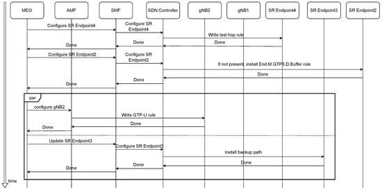 Figure 8 shows the control plane procedure for path migration. The MEO configures gNB2 to apply the H.Encaps.Red. gNB2 includes within the SRH, the SR Endpoint4’s End SID and sets the SR Endpoint2’s End.Buffer SID as the destination address of the IPv6 outer header. Firstly, the MEO asks the SMF to activate the SDN controller for SR Endpoint4 configuration. The latter requires a rule to forward the packets to the designed container once decapsulated. Subsequently, the MEO prompts the AMF to configure the H.Encaps.Red encapsulation rule on gNB2, as just described. At the same time, the MEO asks the SMF to trigger the SDN controller for configuring the H.Encaps.Red rule on SR Endpoint2 to redirect the on-the-fly packets. The latter rule must include the SR Endpoint2’s End.Buffer SID.