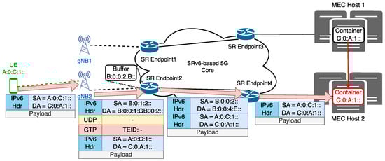 Since the UE has mobility capabilities, a handover, e.g., from gNB1 to gNB2 could occur. Assuming a non-roaming handover, the client retains its original IPv6 address. The MEC architecture provides mechanisms to support service instance migration and information transfer between MEC Hosts [44]. Upon notification from the 5GC regarding the UE mobility, the MEC system can initiate the migration of the corresponding service from MEC Host1 to MEC Host2. The migration in this case is the procedure that allows a running container to be moved from one host to another [45]. Uplink packets traverse the 5GC via SR Endpoint2 and exit through SR Endpoint4. As soon as migration is triggered, a network update to reroute packets toward the new destination is enforced.