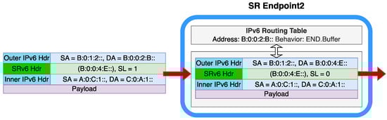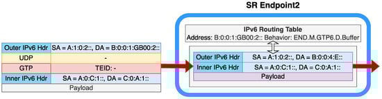 The Enhanced Mode, characterized by comprehensive SRv6 encapsulation, requires the configuration of routing rules only on gNB2, SR Endpoint4, and SR Endpoint2. gNB2 is in charge of encapsulating the packets in an IPv6-SRv6 header. During the migration interval, gNB2 must include in the segment list the SID identifying the End.Buffer behavior for SR Endpoint2.