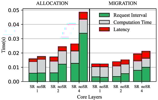 Figure 17 confirms that the most significant difference in terms of the rule installation time between the SRv6 and non-SRv6 approaches is given by the request interval. This is due to the fact that in the solution without SRv6, it is necessary to configure a much larger number of devices. The other components, transmission time, and processing time of a request are similar in both cases, as expected.