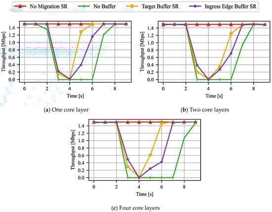 Figure 19 shows the throughput of an iperf3 application, measured at the server side, over a 10 s time interval including migration. The client sent 5 MB to the server with a bandwidth limited to 1.5 Mbps. The throughput is measured for each of the network topologies described previously. The considered server container required, on average, 3.19 s for migration. Figure 19 confirms the throughput stability of around 1.5 Mbps in static conditions and shows similar performances in the other three scenarios. They have a similar throughput drop during the container downtime, despite the considered topology. The main difference is the time required by the throughput to go back to its original stable value. The No Buffer scenario takes more compared to the buffering cases, and the difference increases with the network depth. The explanation for this outcome is based on the necessity to retransmit lost packets, requiring them to traverse the entire network before reaching their target destination. To conclude, Figure 19 shows the slight superiority of the Target Buffer compared to the Ingress Edge Buffer despite the topologies.