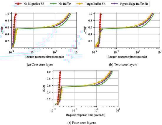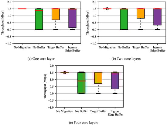 Figure 20 shows the boxplot of the throughput in the four scenarios listed above, using the same network topologies. Data are taken from a 10 s time interval containing migration, and they have been aggregated. The boxplot graphs appear as expected, following the conclusions taken from those of Figure 19. In the No Migration scenario, the box is collapsed in a line, corresponding to the median. This is due to the throughput constant value of around 1.5 Mbps. The No Buffer case, instead, has the wider box, due to a larger number of values equal to zero and to the slower throughput increment after container restoration. The reason is the packet retransmission. The buffering cases have a better performance compared to the No Buffer one. Their throughput increases faster, with the Target Buffer exceeding the Ingress Edge Buffer. Finally, as shown in Figure 21, we analyzed the performance in terms of the request–response time in a dynamic scenario, using the TCP-based client–server application already exploited in Section 6.2.2. In this case, the container migration procedure lasts 3.28 s, on average. As shown, the No Migration scenario is the best, as expected. Concerning the migration cases, those approaches with buffer outperform the one without it, and they have a similar performance irrespective of the topology. The use of the buffer, enabling the prevention of packet losses, allows having the increase in the request–response time as close as possible to the container downtime, in the worst case.