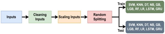 This section discusses the applied machine learning and deep learning models, the experiment in detail, and the dataset used. The entire workflow of this study is shown in Figure 1. This study starts with collecting the data and cleaning the data to remove null and inconsistent values. Then, we perform scaling over the inputs to remove the bias of a specific activity on the outcome. We further split the data into training and test sets randomly and, finally, trained and tested the machine learning (ML) and deep learning (DL) models. The details of each ML and DL model are described in the following subsection.