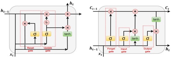 The base architecture of the GRU is shown on the left side of the figure, and the LSTM is shown on the right side of the figure. In this figure, the input data at time step t are denoted as , the hidden states are shown with h, and the cell states are indicated by C.