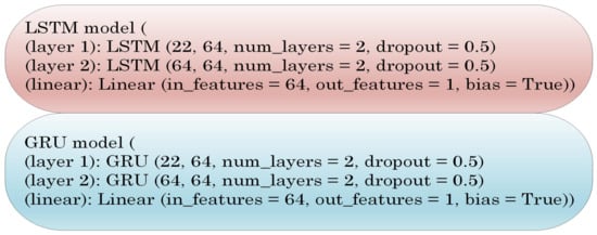 For anomaly detection, we employed models based on both the LSTM and GRU, which share the same underlying architecture. We employed a straightforward design consisting of two LSTM/GRU layers, each comprising a pair of LSTM/GRUs units.