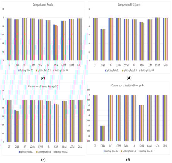 The figures presented here demonstrate the relative performance of various models on the House A data from the ARAS dataset. The sub-figures (a–f) display the accuracy, precision, recall, F-1, macro F-1, and weighted F-1 scores, respectively, obtained by applying ten machine learning and deep learning models at different splitting ratios for the training and testing sets. These ratios include 80:20, 70:30, and 60:40 for training and testing.