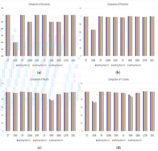 We evaluated the performance of various models using the House A data in different splitting ratios (80:20, 70:30, and 60:40) for training and testing. The results of the applied models are shown in Figure 4. The figure indicates that, for the most part, the performance of the same classifiers did not vary significantly across different splitting ratios. Figure 4c–e show that the Gaussian naïve Bayes (GNB) and KNN classifiers performed differently in terms of the recall, macro F-1, and weighted F-1 scores for different splitting ratios. The performance of the other classifiers remained consistent across different splitting ratios in regard to most of the metrics, suggesting that splitting ratios do not significantly impact performance. However, there was a significant difference in performance among the classifiers.