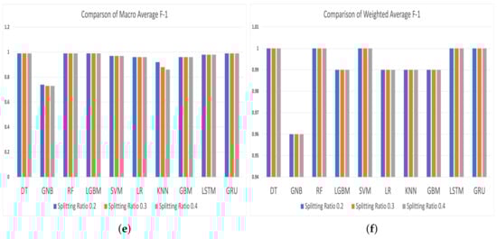 The figures presented here demonstrate the relative performance of various models on the House B data from the ARAS dataset. The sub-figures (a–f) display the accuracy, precision, recall, F-1, macro F-1, and weighted F-1 scores, respectively, obtained by applying ten machine learning and deep learning models at different splitting ratios for training and testing sets. These ratios include 80:20, 70:30, and 60:40 for training and testing.