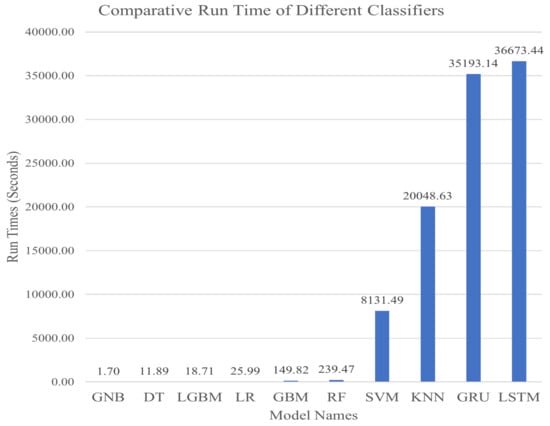 Comparative analysis of the run time of different classifiers from training to testing. The run time is computed in seconds.
