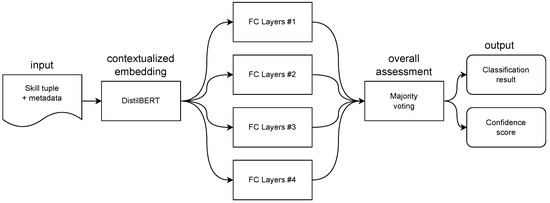 Figure 2 offers an overview of the selected approach. In this deep learning ensemble, DistilBERT plays a central role in encoding the bipartite skill tuple into a contextual embedding. Subsequently, the ensemble leverages four different fully connected neural networks to assess different parts of DistilBERT outputs. Table 5 provides an overview of the hyperparameters used within the ensemble classifier.