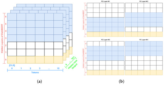 Each classifier used in the ensemble draws upon different portions of the DistilBERT embeddings. Figure 3a,b illustrate how a tensor of three sequentially hidden layers (marked in blue) is combined with a common ground layer (marked in orange) to form the ensemble classifiers’ input. The network-specific hidden layers and the common ground layer are concatenated and afterward transformed into a 1D vector for the fully connected neural network, which is then trained on these data. A majority voting mechanism is used to generate two crucial outputs: (i) an overarching assessment and (ii) a confidence score. The confidence score serves as a metric to gauge the consensus among the various neural networks regarding their evaluations.