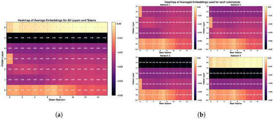 Heatmaps of embeddings from DistilBERT. (a) Heatmap of the average gold standard embeddings from DistilBERT. (b) Heatmap of gold standard embeddings for each network from DistilBERT.