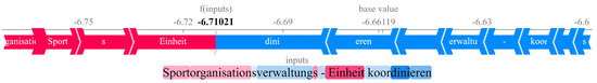Figure 5 shows the Shapley values [48] for the longest bipartite skill label extracted from the gold standard. The Shapley values suggest that substantives tend to have negative values, whereas verbs and denominatives tend to have positive values, as illustrated in blue. This observation implies that although the classifier operates on bipartite skill labels, subtokens still provide additional context due to their impact on each other’s meaning. We therefore consider all DistilBERT tokens in the ensemble networks.