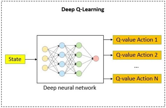 where represents the TD error, R is the immediate reward, is the discount factor (between 0 and 1), represents the maximum expected future reward the agent can achieve from the next state , and represents estimated Q value for taking the chosen action a in the current state s, which is also based on the current policy parameters . The loss function used during training, denoted by L, is based on the Mean Squared Error (MSE) between predicted and target Q values as given in Equation (9).