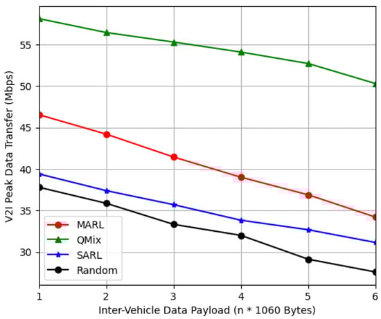 Figure 5 delivers a powerful illustration of how the proposed QMIX scheme transcends existing approaches, particularly the baseline MARL scheme, in ensuring seamless V2I performance, especially as V2V data sizes inflate. Unlike the diminishing V2I transmission rates exhibited by other methods as data loads increased, QMIX maintained an impressive consistency, thus showcasing remarkably high rates over its competitors. From Figure 5, we can observe that when the payload size was 1 × 1060 bytes, the corresponding improvement of the QMIX was 24.91% as compared with the benchmark MARL technique. As we increased the payload size, the efficiency of the proposed QMIX technique remained improved at 27.7%, 33.46%, 38.67%, 42.86%, and 47.17%, respectively. Figure 5 shows that the average improvement of the proposed technique over MARL was 35.795%. This unwavering performance signifies QMIX’s superior adaptability and effectiveness in handling diverse data demands within V2X communication scenarios.