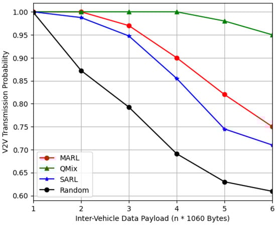 This consistent performance across varying data sizes signifies the strength and potential of QMIX. It underscores its ability to deliver enhanced transmission performance, even in the dynamic and challenging environment of V2V communication. The QMIX adaptation in V2X networks can significantly improve data communication performance.