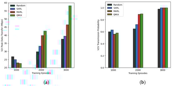 In addition, it is important to note that the number of training episodes greatly influences the effectiveness of the QMIX method. When the training duration is very short, agents cannot adequately explore their environment, and reinforcement learning-based strategies may not perform better than random baseline approaches. This behavior is demonstrated in Figure 7, where the performance of the V2I (Figure 7a) and V2V (Figure 7b) links is shown for a fixed payload size. We can observe that, particularly in scenarios with limited training time—around 2000 training episodes—the QMIX approach offered significant benefits.