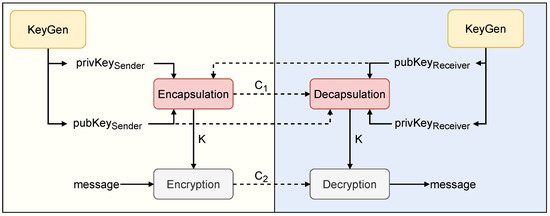 - An encapsulation operation that takes a key pair of the sender, and a public key of the receiver, and outputs a shared key K and an encapsulated text .