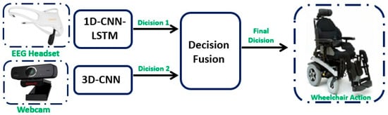 In this paper, we proposed a smart wheelchair control system designed to aid individuals with physical impairments in their mobility. Our approach integrates fusion between decision modes from an EEG signals sensor and a webcam images sensor, achieving an outstanding accuracy level of up to 99% in emotion recognition. The incorporation of CNN and LSTM architectures through a fusion algorithm exhibits superior performance, surpassing single-modality methodologies. This comprehensive approach not only advances the field of human–computer interaction but also contributes to assistive technologies, thereby improving the quality of life of individuals with mobility impairments.