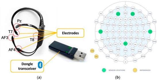 We employed the EMOTIV Insight headset in this study, which can be seen in Figure 2a. This device has 5 electrode channels (AF3, T7, PZ, T8, and AF4). Figure 2b represents the location of all five channels in the brain. The data were sampled using a 16 bit analog-to-digital converter at a frequency of 128 Hz [28].