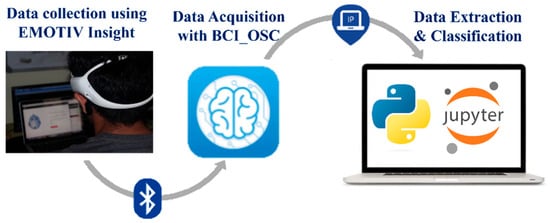Brain waves are analyzed by the EEG headset, which then wirelessly transmits the data to a computer via Bluetooth. EEG data gathering is made possible using the EMOTIV (BCI-OSC) V3.5 software interface. Figure 3 represents the architecture of the headset for the acquisition and processing of EEG signals from EMOTIV Insight.
