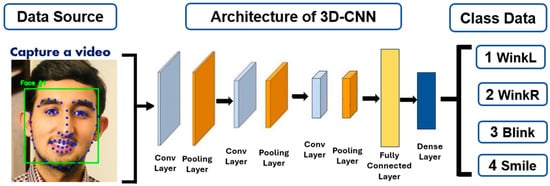 The neural network topology (3D-CNN) is depicted in Figure 6. CNN has extensive applications in various domains, such as natural language processing, recommendation systems, and image and video recognition. These networks were utilized in our situation to process images for smiling, winking to the left or right, and blinking of the eyes.