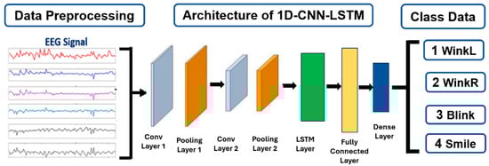 Figure 7 represents the architecture of our system. In this work, we processed EEG signals for the estimation of facial expressions using a CNN and LSTM combination [34]. The ability to extract robust features from CNNs and go beyond the drawbacks of conventional techniques is a true advantage of CNN networks. Three layers make up the network: LSTM, max-pooling, and convolutional. The convolutional layer filters the input signals. The max-pooling layer reduces the size of the data while preserving their features, which helps to shorten the training period. Using the EEG database, the LSTM layer trains the model and performs classification [34].