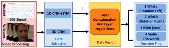 In the “webcam-based command” section, we will present the fundamental structure of the 3D-CNN connected to image classification. Moving on to the “EEG headset-based command” section, we will delve into the essential components of the 1D-CNN-LSTM approach for processing EEG data. Lastly, in Section 3, we will introduce a feature fusion network that combines the two aforementioned methods and elaborate on our selection process for the network parameters.