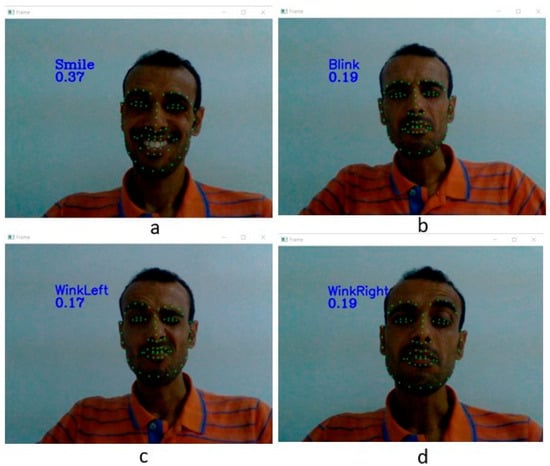 Experimental result of facial expressions with a webcam: (a) emotion Smile, (b) emotion Blink, (c) emotion wink Left, (d) emotion wink Right.