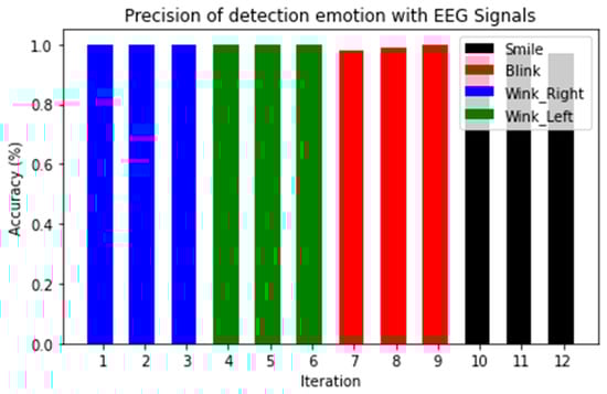 The results of facial expressions inferred from the EEG signals are presented in Figure 10. They correspond to four distinct expressions, labeled from one to four, namely “Wink Left” (1), “Wink Right” (2), “Blink” (3), and “Smile” (4). Each expression is associated with values ranging from 0 to 1, which can be interpreted as percentages, representing the intensity or level of the respective expression.