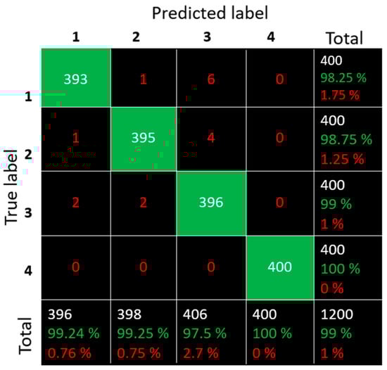 Confusion matrices are a valuable tool for evaluating classification models by summarizing the relationship between predicted and actual labels. They are structured as N × N tables, with one axis representing predicted labels and the other axis representing true labels. In a multiple classification problem with N classes, confusion matrices provide insights into the model’s classification accuracy and revealing its strengths and weaknesses. In our multiple classification problem, N = 4.