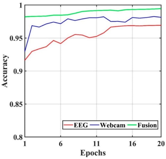For example, in epoch 11, the accuracy of fusion is up to 0.99 whereas the accuracy of EEG signals and webcam are limited to 0.95; 0.98, respectively.