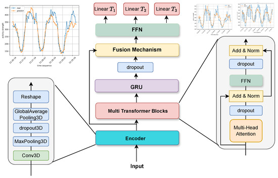 The TE-CNN-RNN architecture begins with a 3D convolutional layer (Conv3D) that acts as the encoder. Its purpose is to extract spatial features from the input data and encapsulate the dimensional intricacies of network traffic. After this spatial feature extraction, the Multi Transformer Blocks process these features, considering their sequential relationships and enriching the model’s understanding of temporal patterns. The GRU layer sequentially explores the dynamics over time, providing a profound temporal analysis. This processing sequence concludes with a fusion mechanism that integrates the derived spatial and temporal features to output a refined prediction ready for effective network management.