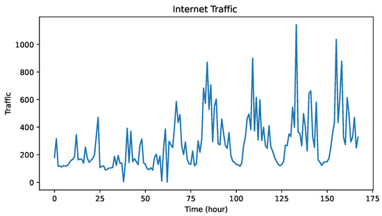 We extract periodic features from INT by selecting different timestamps, as INT exhibits both temporal and periodic characteristics. As depicted in Figure 4, the network traffic consistently peaks simultaneously every day. This repetitive pattern reflects the daily routine of people using the network, with peak usage typically occurring between 11:00–13:00 and 17:00–19:00, represented in hours. Additionally, the weekly pattern affects network traffic, varying significantly between weekends and weekdays, with generally lower and more variable traffic on weekends.