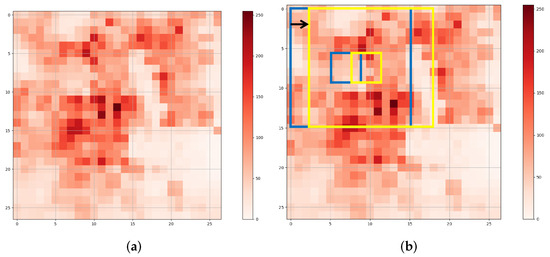 The structure illustrated in Figure 3 accepts six data types as input. Five of these are directed into the neural network, preserving a consistent architecture. One of the input data types is internet traffic (INT), which is part of the call detail records (CDRs) and is represented by : . Each data point in INT corresponds to a grid map, with each interval spanning 10 min. However, our study only considers a section of the grid map as the INT input. Moreover, since we focus on forecasting for Milan’s city center, we treat the central area as the target label.