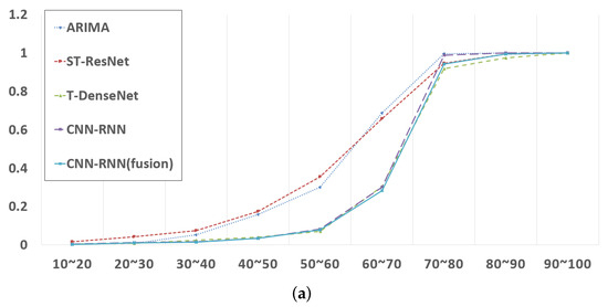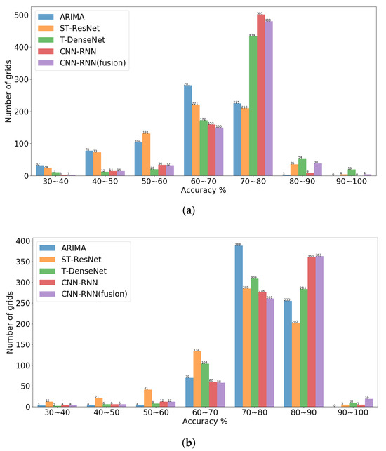 Regarding the maximum task, our approach (CNN-RNN (fusion)), as noted in Table 9, achieves an accuracy of 81.7%, marginally higher than the T-DenseNet model. However, Figure 9a reveals that the T-DenseNet model’s cumulative accuracy surpasses 70% in a more significant number of grids. This implies that the T-DenseNet model has more grids with high or low accuracies. In contrast, our method demonstrates a more consistent performance, yielding an average accuracy within the 60% to 80% range.