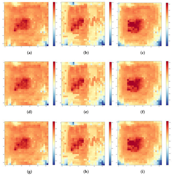 Accuracy map of Max/Avg/Min value. (a) INT(Max), (b) ST-ResNet(Max), (c) T-DenseNet(Max), (d) INT(Avg), (e) ST-ResNet(Avg), (f) T-DenseNet(Avg), (g) INT(Min), (h) ST-ResNet(Min), (i) T-DenseNet(Min).