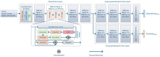 Based on the optimization of depth, width, and resolution, EfficientNet, as a CNN model, provides better classification accuracy with a smaller number of parameters by virtue of efficient parameter settings. Seven such models are proposed in [], from EfficientNet-b0 to EfficientNet-b7, and their number of parameters gradually increases from 5.3 M to 66 M. In the ImageNet [] dataset, EfficientNet has a much smaller number of parameters compared to other models with similar accuracy. For example, the classic ResNet50 [] has about 26M parameters but its performance is lower than EfficientNet-b1, which has no more than 8M parameters. In this paper, we utilize the mobile inverted bottleneck convolution (MBConv) block of EfficientNet as the basis to build the feature extraction module. A single MBConv block contains a classical convolutional block (i.e., a stack of convolutional, batch normalization, and activation layers), a squeeze-and-excitation module [] to provide a channel attention mechanism, and a 1 × 1 convolutional layer paired with residual connections. As shown in Figure 3, our proposed multi-branch visual feature extraction module employs a stack of convolutional layers in a multi-branching pattern, which is divided into a front segment and a back segment. When the model uses only shared convolutional blocks and one branch convolutional block, the model will converge to the same as EfficienNet-b1.