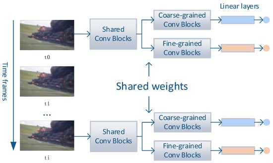The convolutional blocks in the front segment will be used as a shared set of convolutional layers and subsequently, two sets of identical convolutional layers, and , in the back segment are constructed for coarse- and fine-grained event classification.
