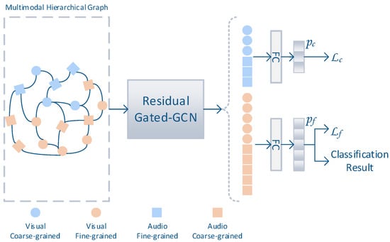 As shown in Figure 6, two linear layers are employed to classify the coarse- and fine-grained events from the event nodes of the multimodal hierarchical graph. The logits output from the linear layers is then used to calculate the error between the true label utilizing the Equations (32)–(34). Fine-grained classification with more event categories will be used as the final classification result.