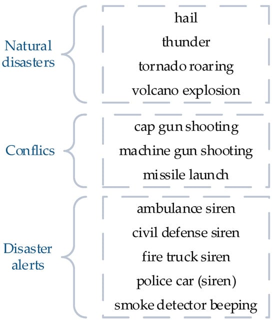 The MHGSA system, based on the two previously mentioned multi-branch feature extraction modules for different modalities, uses a residual gated graph convolutional neural network based on hierarchical graphs as multimodal feature fusion. We extracted 12 categories from the original VGGSound dataset and categorized them into three categories as coarse granularity labels (Figure 7). We referred the extracted dataset as VGGSound for Disaster Response (VGGSound-DR).