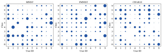 Datasets and models. We use four common datasets: MNIST [36], FMNIST [37], CIFAR-10, and CIFAR-100 [38]. Each dataset is divided into an 80% training set and a 20% testing set. These datasets are distributed across 50 clients. The training set and testing set on each user have the same data distribution, with no overlap between the training and testing sets. We construct non-iid datasets using the Dirichlet distribution Dir(0.5). We train a LeNet for MNIST and several Convolutional Neural Networks (CNN) for the FMNIST, CIFAR-10, and CIFAR-100 datasets. Each CNN comprises two convolutional layers and three fully-connected layers. The HN used in all three tasks is an MLP model with two hidden layers. To visualize the data heterogeneity among users, we described the heterogeneity for the first three datasets of 10 users using Dir(0.5), as demonstrated in Figure 4. The presence or absence of dots indicates the existence of specific data, while the dot size reflects the quantity of that data.