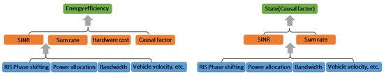 - State space: Consider as the state space, which comprises the following constituents: (i) the channel gains for communication links: and , (ii) the velocity and position of intelligent vehicle agents , (iii) actions involving the configuration of phase shifting for the RIS components and power distribution of implemented at time , and (iv) the energy efficiency at time . Hence, S encompasses: