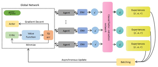 An ensemble DNN algorithm is provided to address the problem of the probability distribution of the causal factor Z required in Equation (17). Then, based on the obtained causal information, to tackle Equation (15), incorporating intervened actions from (10), we employ the asynchronous advantage actor–critic(A3C) algorithm to optimize the entire network output. The structure of our proposed algorithm is illustrated in Figure 4.
