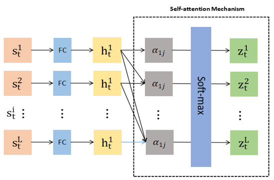 There are L electric vehicle (EV) users in the charging network and L corresponding subcarriers in the network, where each subcarrier’s state information is represented as the concatenation of described in Equation (9) and a described in Equation (10), , where , and d is the dimensionality of the state features. The input sequence is represented as . The corresponding feature representation can be regarded as the global environmental information for subcarrier i, is subcarrier j’s state and is a weight for :