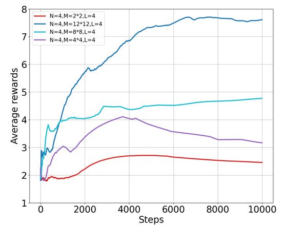Average rewards vs. num. of RIS units with M = 2 × 2, 4 × 4, 8 × 8, 12 × 12.