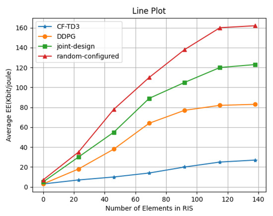 The developed algorithm will optimize the control of RIS phase shifting and allocation of transmit power to stimulate the full potential of multi-RIS-assisted wireless networks. The performance of the developed reinforcement learning algorithm based on CF-A3C is illustrated below. Figure 7 compares the different learning process numbers of RIS units (). As shown in Figure 8, increasing the number of RIS units can improve energy efficiency, and the proposed CF-A3C algorithm significantly outperforms other benchmark algorithms.