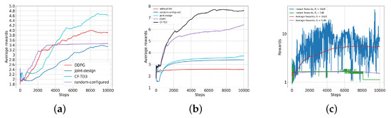 The average rewards vs. time steps. (a) Average rewards vs. time steps. (b) Average rewards vs. time steps. (c) Average reward vs. time steps under different .