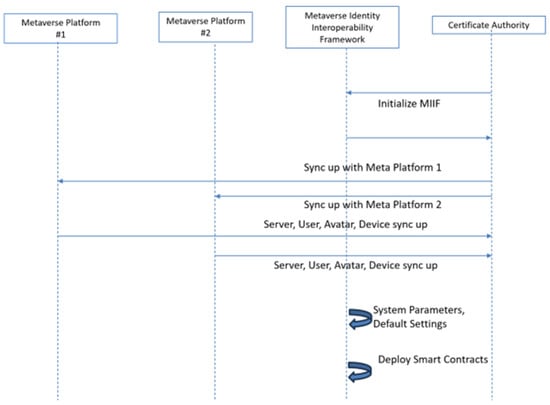 - Initialization: In the initialization phase, the CA initializes all of the system parameters, default users, avatars, etc. It syncs up all of the metaverse platforms, and all of the smart contracts are deployed in the MIF.